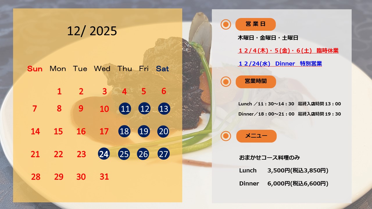 木・金・土曜日 Dinner/18:00~21:00 最終入店時間 19:30
